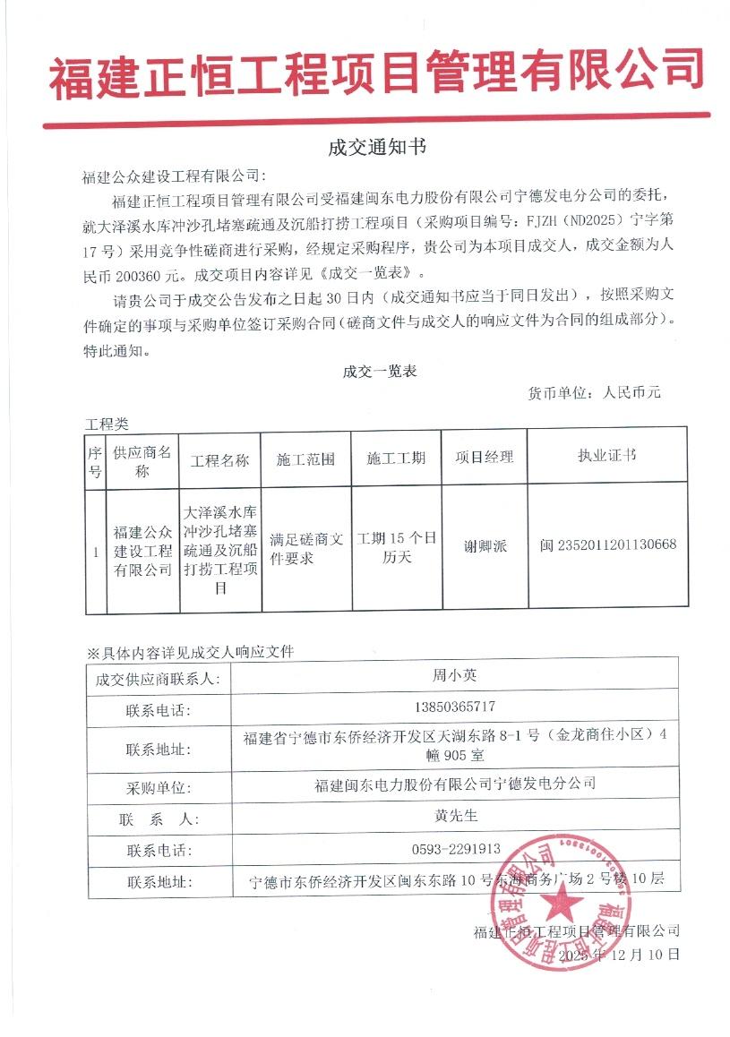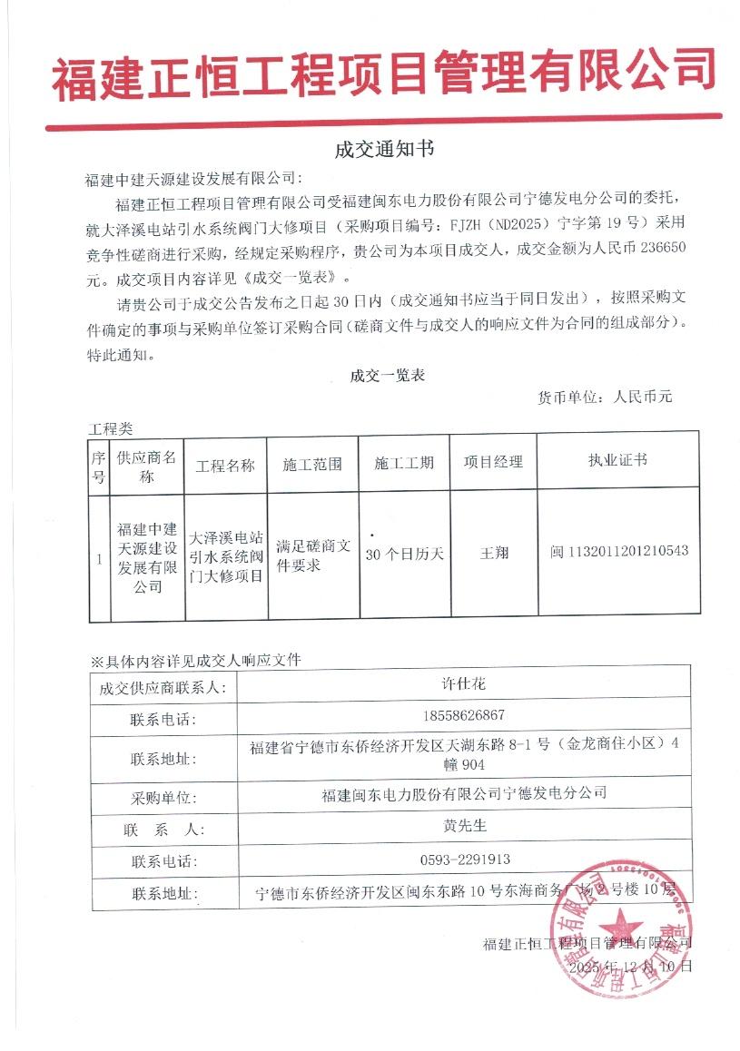 大澤溪電站引水系統(tǒng)閥門大修等項目成交通知書
